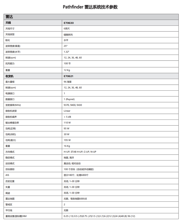 Pathfinder雷达配套窄截面6英尺阵列长天线,由无风扇电机驱动,提供卓越的高清雷达回波图像和直观的用户界面。利用CHIRP脉冲压缩和波束锐化技术为船舶驾驶人员提供卓越的方位分辨率和距离分辨率。110W固态收发机性能优于12KW磁控管收发机,整套系统满足并超过IMO对目标探测的所有性能要求。Pathfinder雷达采用轻量化设计,总重量仅为同类雷达的一半,天线采用小口径连接电缆,便于布线和安装。